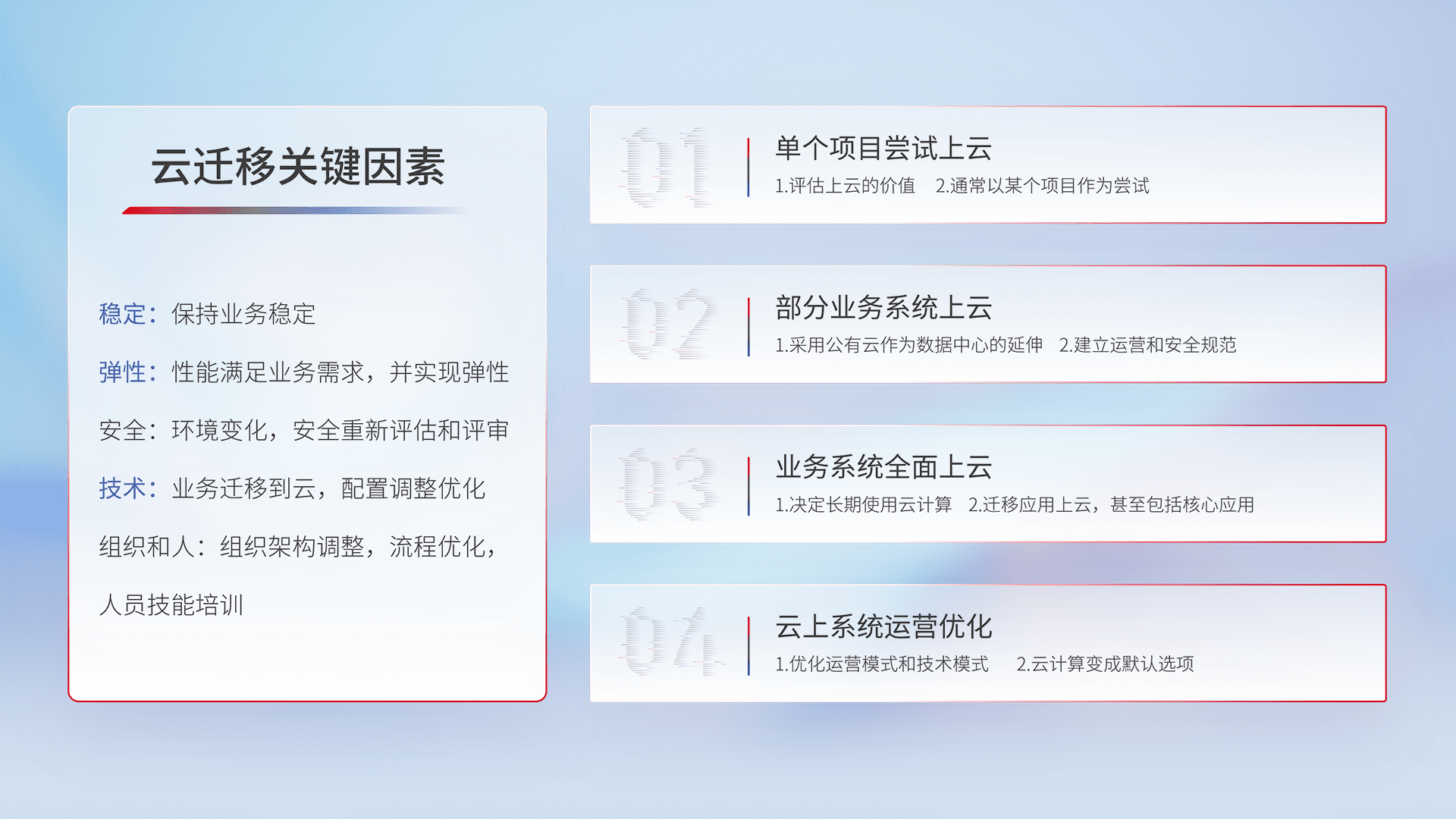 结合实际业务,,,从规划设计、、云平台选型、、、云原生改造、、数据迁移、、集成交付,,迁移全过程为客户识别最佳上云路径,,,,做好风险识别管理,,,设计网络架构、、身份权限、、、安全审计合规、、、、操作审计、、、日志审计、、、监控告警策略、、、、多站点容灾设计等,,,,对云上基础设施进行整体规划,,提升IT治理水平,,,,以满足弹性、、、高可用、、、、高性能的需求。。