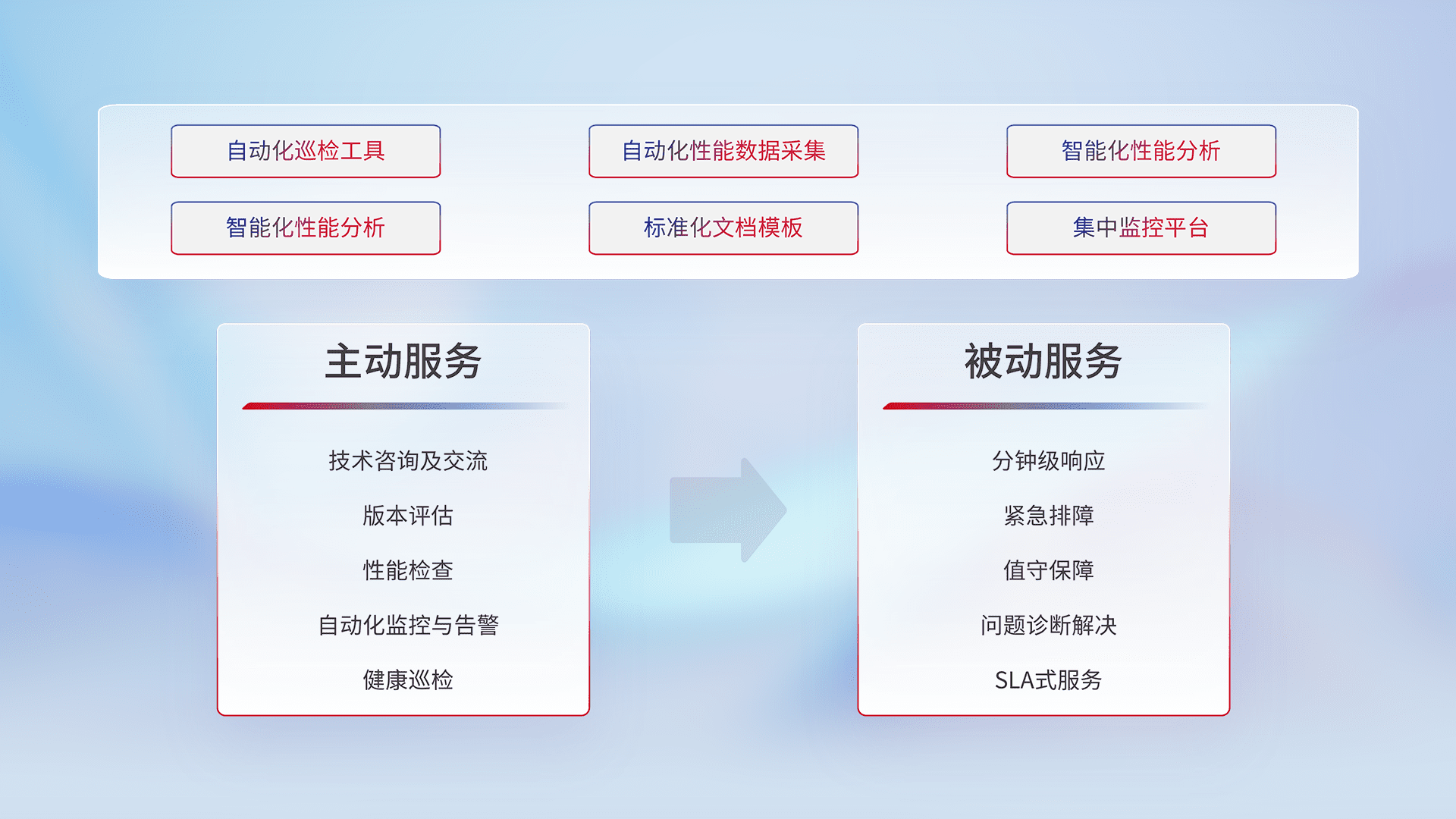 智能化工具和标准化文档,,保障服务质量,,,,提供主动服务(包含技术咨询、、、版本评估、、、、性能检查、、自动化监控与告警、、健康巡检)和被动服务包含(分钟级响应、、、紧急排障、、、、值守保障、、问题诊断解决、、、、SLA服务)。。。。